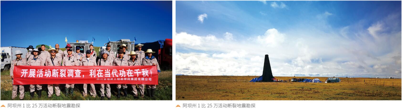 川勘集團緊密圍繞國家重大戰略資源需求和重大地質安全保障目標,積極開展相關地區的區域地質調查與活動斷層普(探)查工作,先后參加了世界最大鋰輝石礦-四川甘孜甲基卡鋰輝石礦區域地質調查(丹東幅、夏多幅等五幅1:5萬區域地質調查)和我國頁巖氣儲量最豐富地區-四川西南地區1:5萬頁巖氣基礎地質調查等工作,為國家探獲重大戰略礦產資源盡一己之力。四川省地震災害多發,為保障人民群眾生命財產和國家重大基礎設施安全,川勘集團還憑借技術優勢積極承擔了活動斷層區域普查和城市探查項目,主要有四川省阿壩州1:25萬活動斷層普查(含成都、綿陽、樂山、宜賓)、阿壩縣1:1萬城市活動斷層探查、松潘縣1:1萬城市活動斷層探查和鹽源縣1:1萬城市活動斷層探查以及全省活動斷層基礎數據庫建庫工作,是承擔此項工作最多、份量最重的地勘單位。
