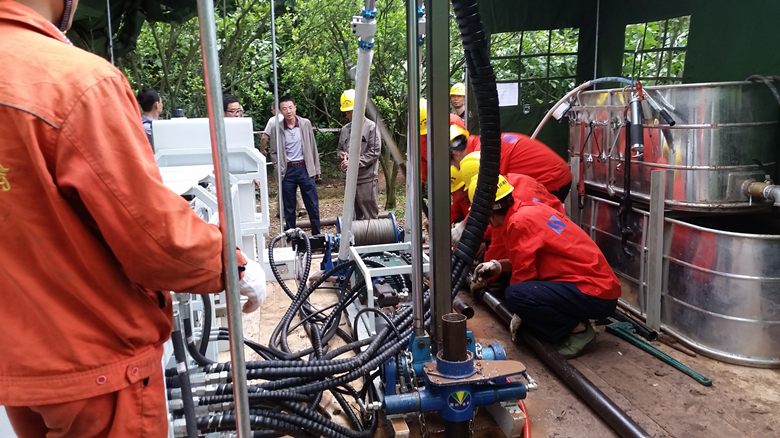 陽書記在查看項目現場,了解設備運轉情況及工人操作后,對項目作出指導:一是該項目是我院在深孔鉆探設備方面的革新及工藝的改革的試點項目,施工班組和管理人員務必高度重視,勇于挑戰;二是要求項目組人員要在如何使設備經濟高效的運轉、發揮設備功效上探索研究;三是通過該項目歷練培養優秀操機手,為今后類似設備的運用儲存技術力量;四是通過對設備的熟悉、掌握,更加注重科技創新,以節約成本,推動我院在深孔鉆探領域的新發展。