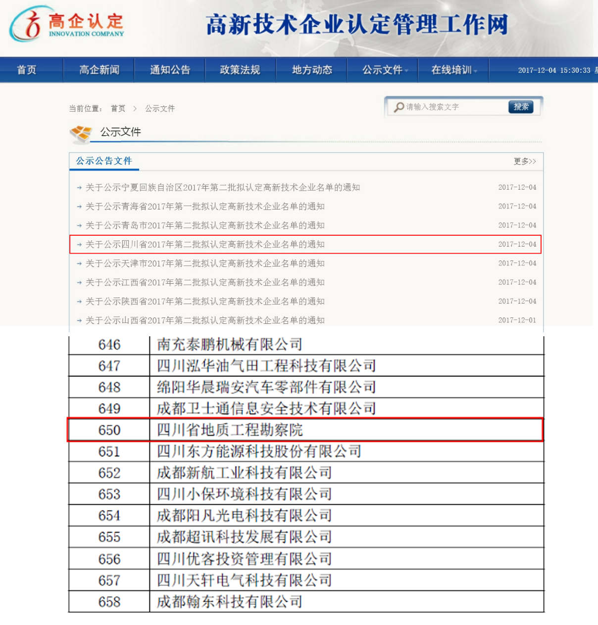 12月4日,國家高新技術(shù)企業(yè)認定官網(wǎng)發(fā)布了“四川省2017年第二批擬認定高新技術(shù)企業(yè)的公示名單”,四川地質(zhì)工程勘察院名列其中,榮膺高新技術(shù)企業(yè)認定。